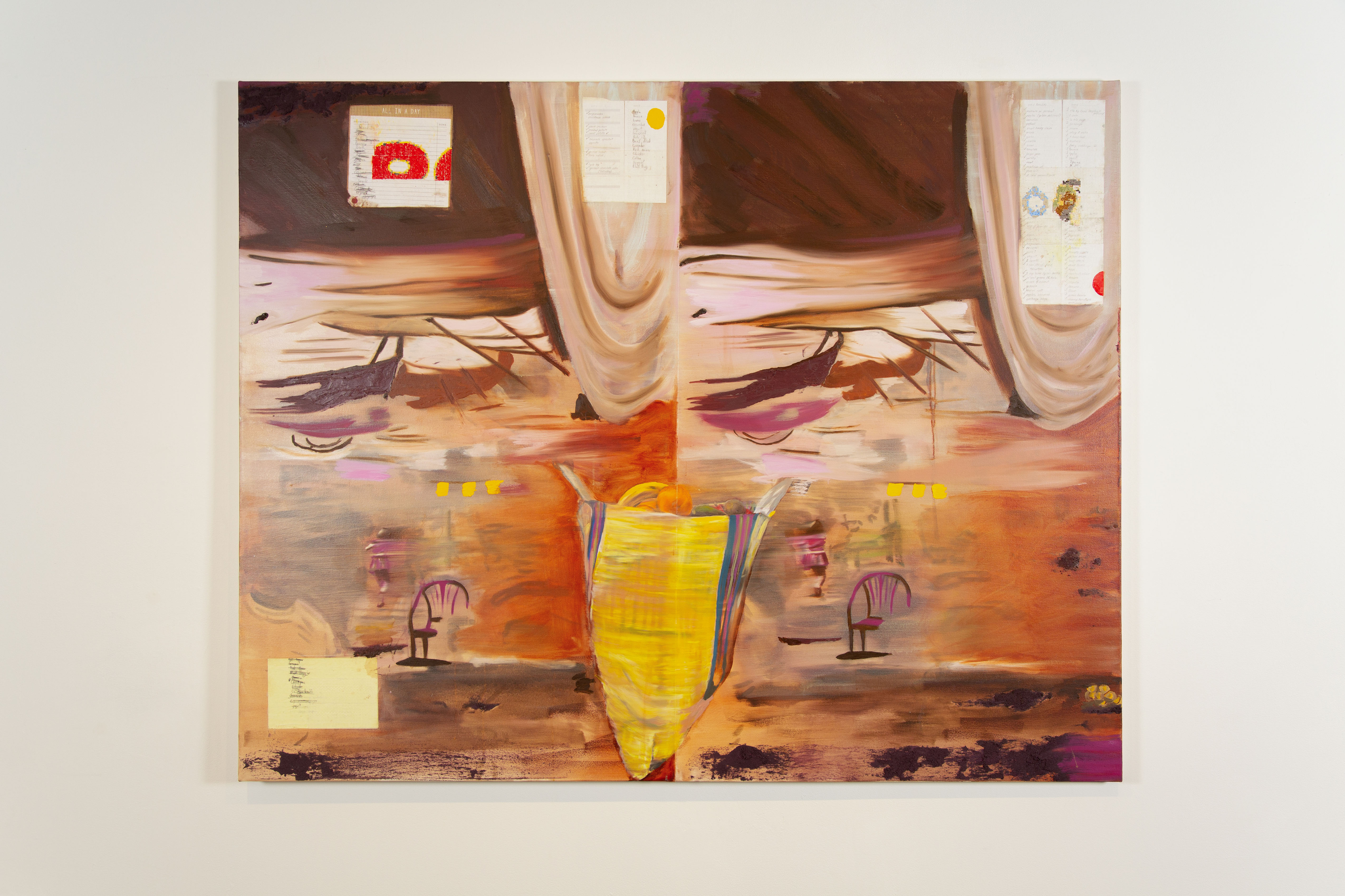 San Camilo, Oil, grocery lists, and dry wall repair tape on canvas, 58” x 64”, 2023