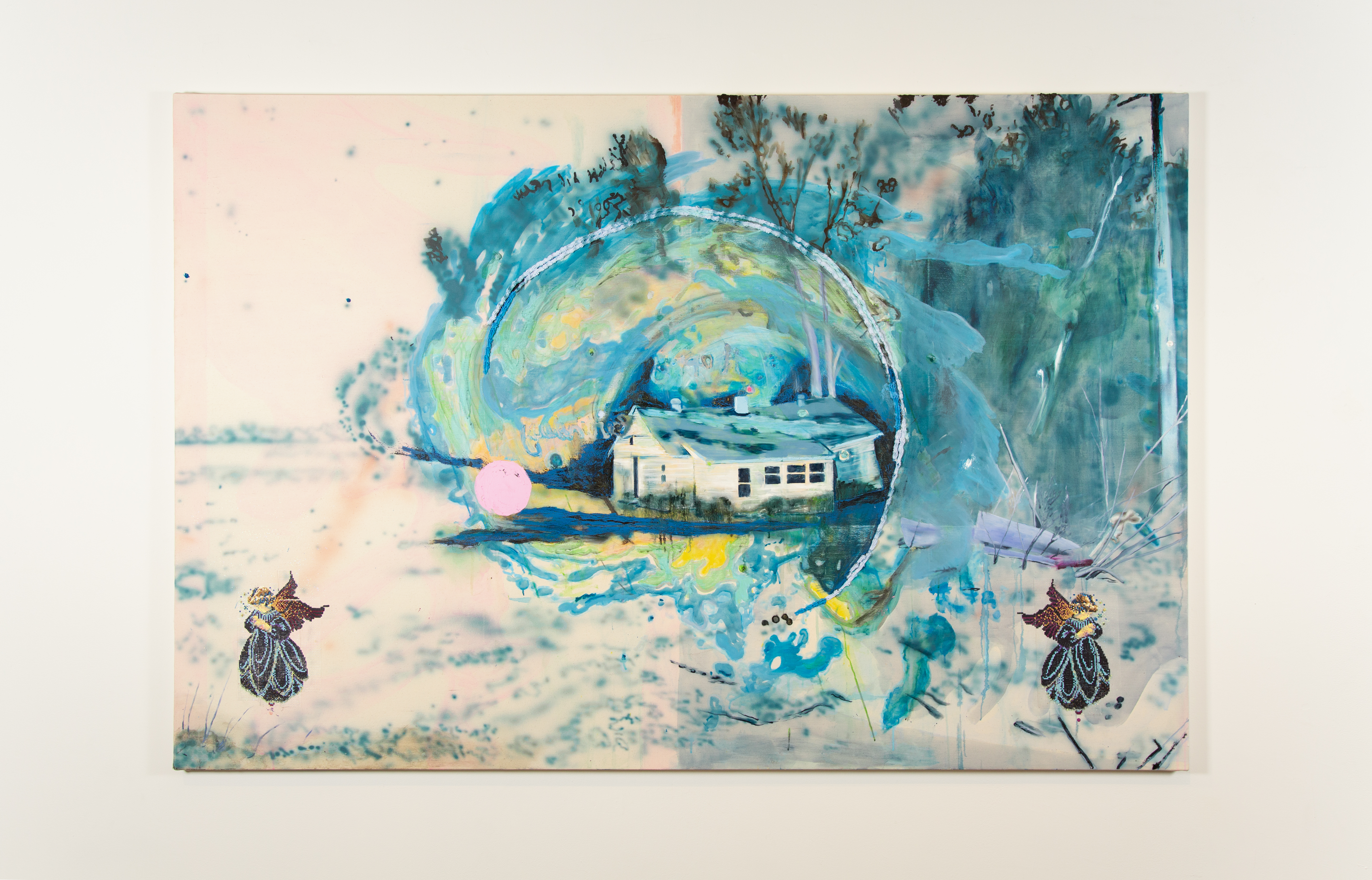 Mississippi Maelstrom & The Angels, Oil, airbrush, gouache, acrylic, seeds, glitter, and drywall repair tape on canvas, 64” x 96”, 2024