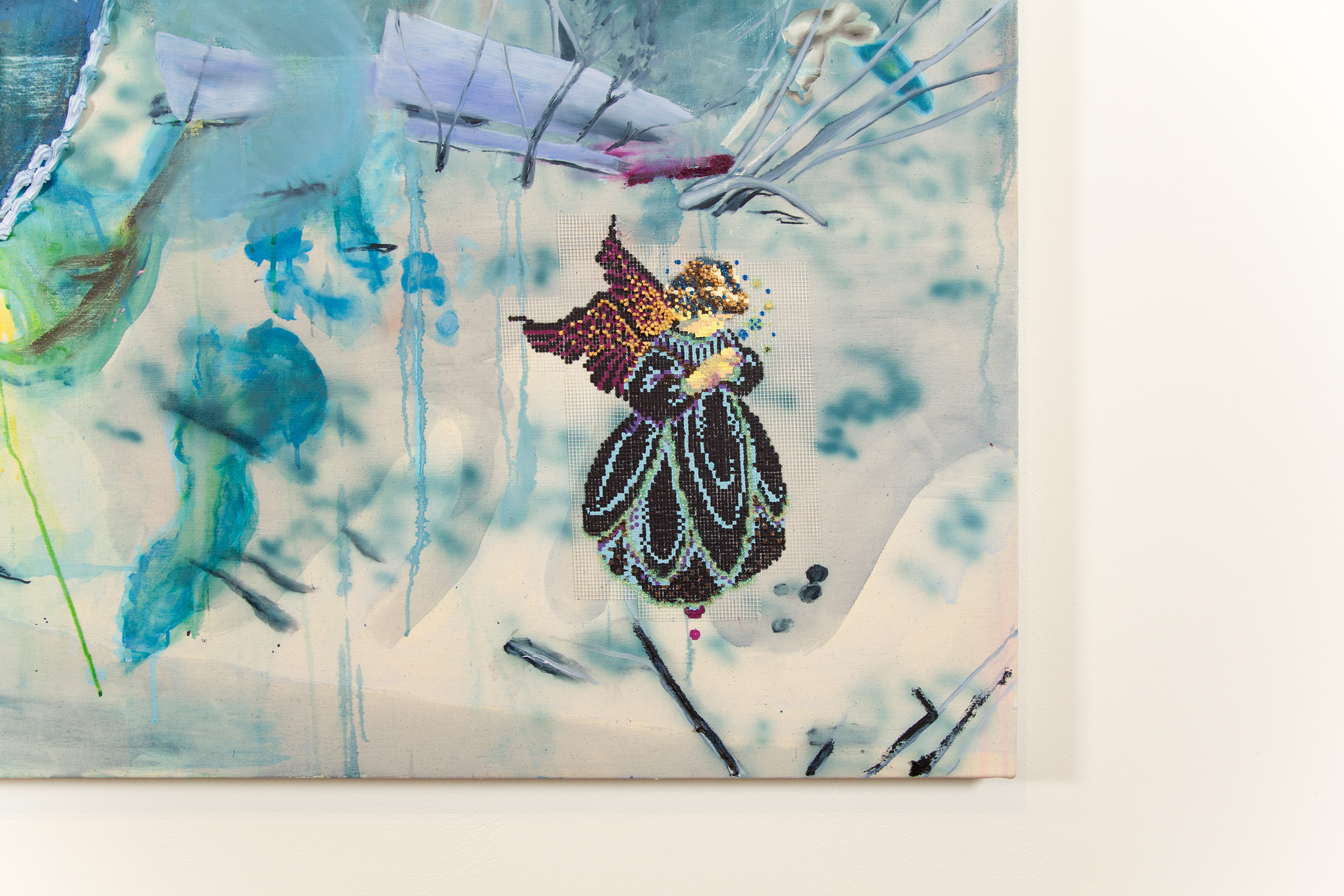 Paradox Lost, Oil, airbrush, gouache, and latchhook on canvas, 72” x 84”, 2023